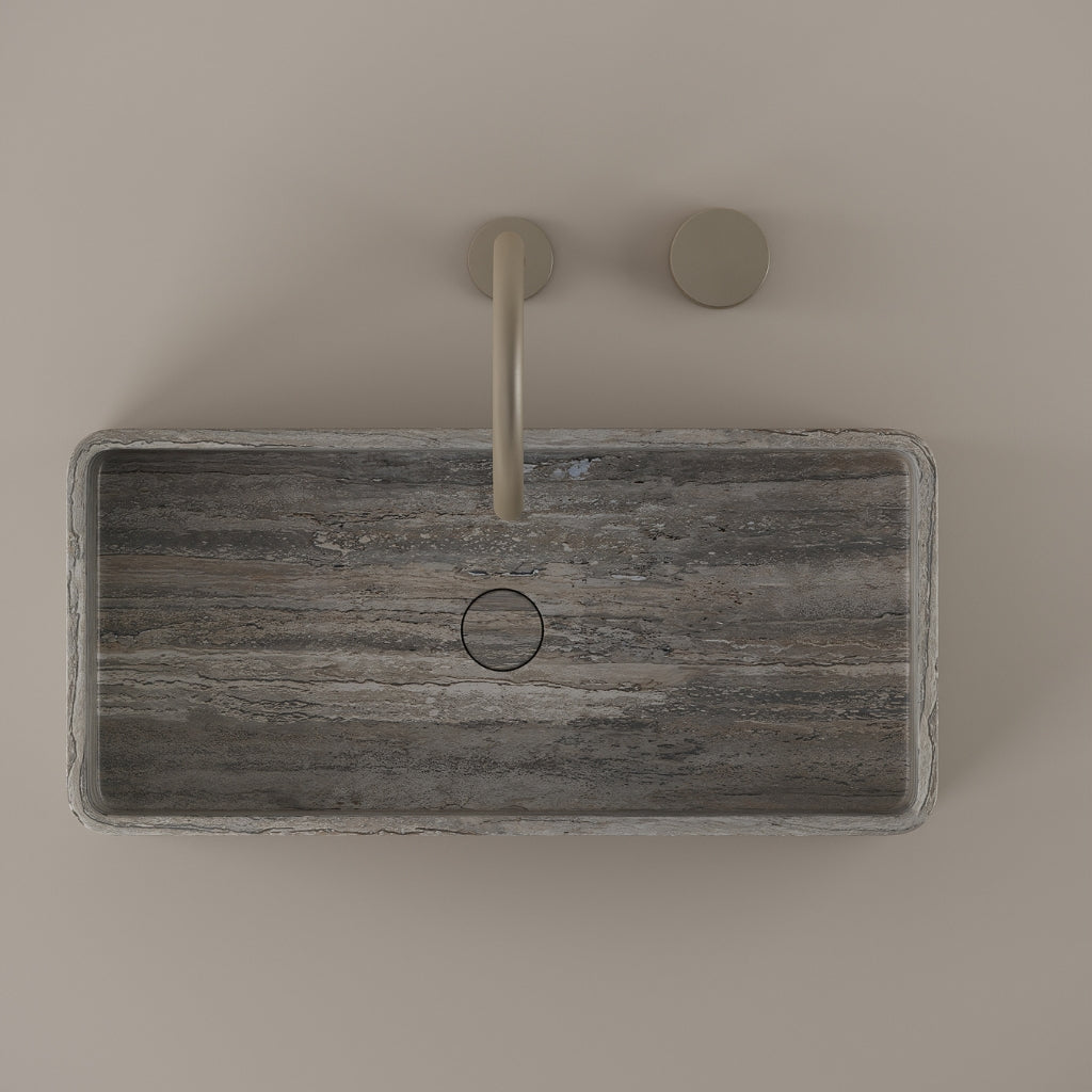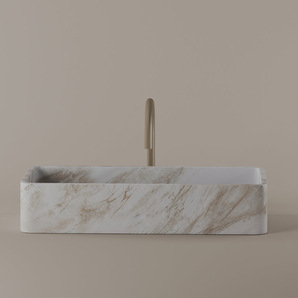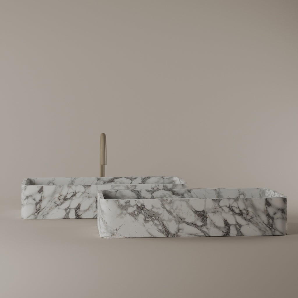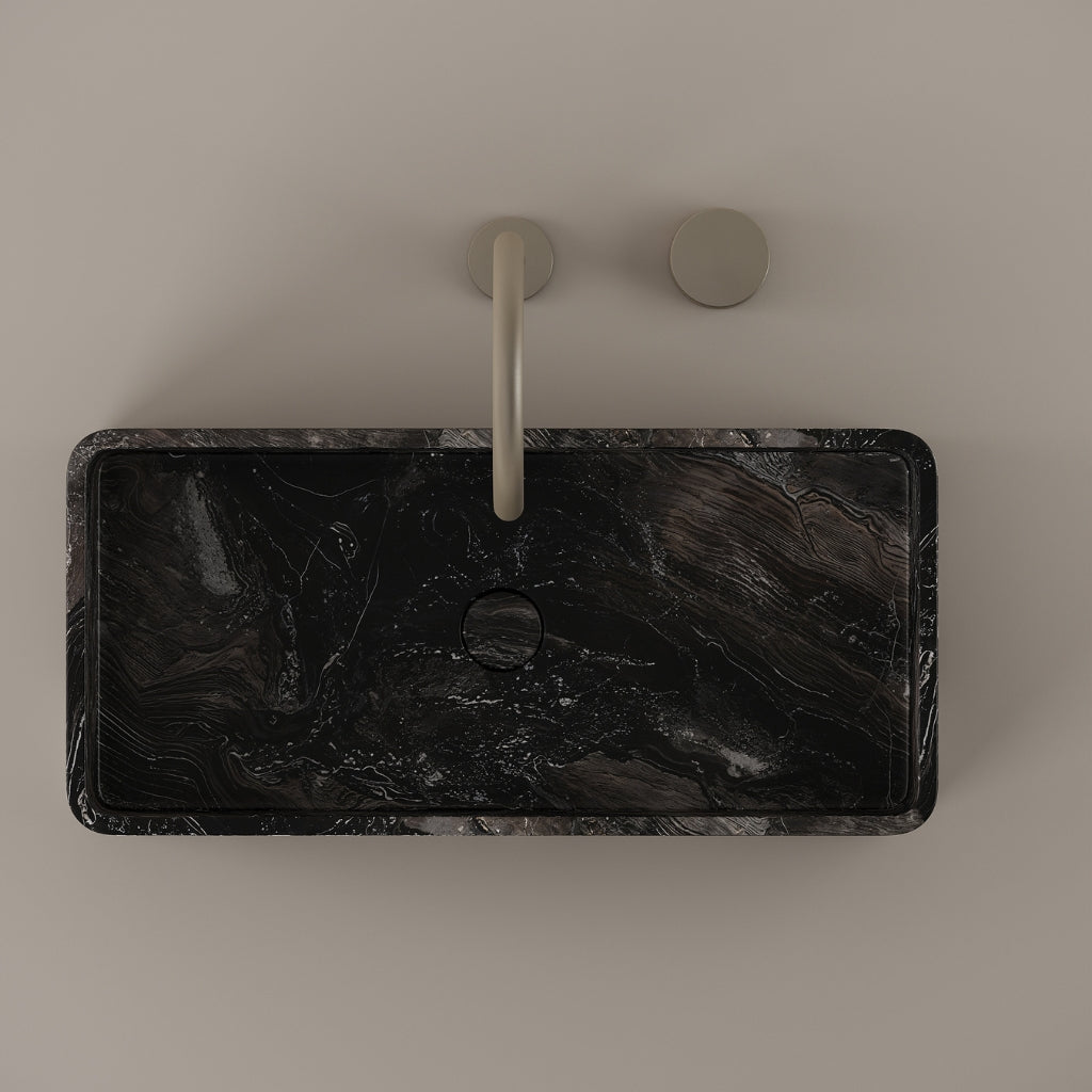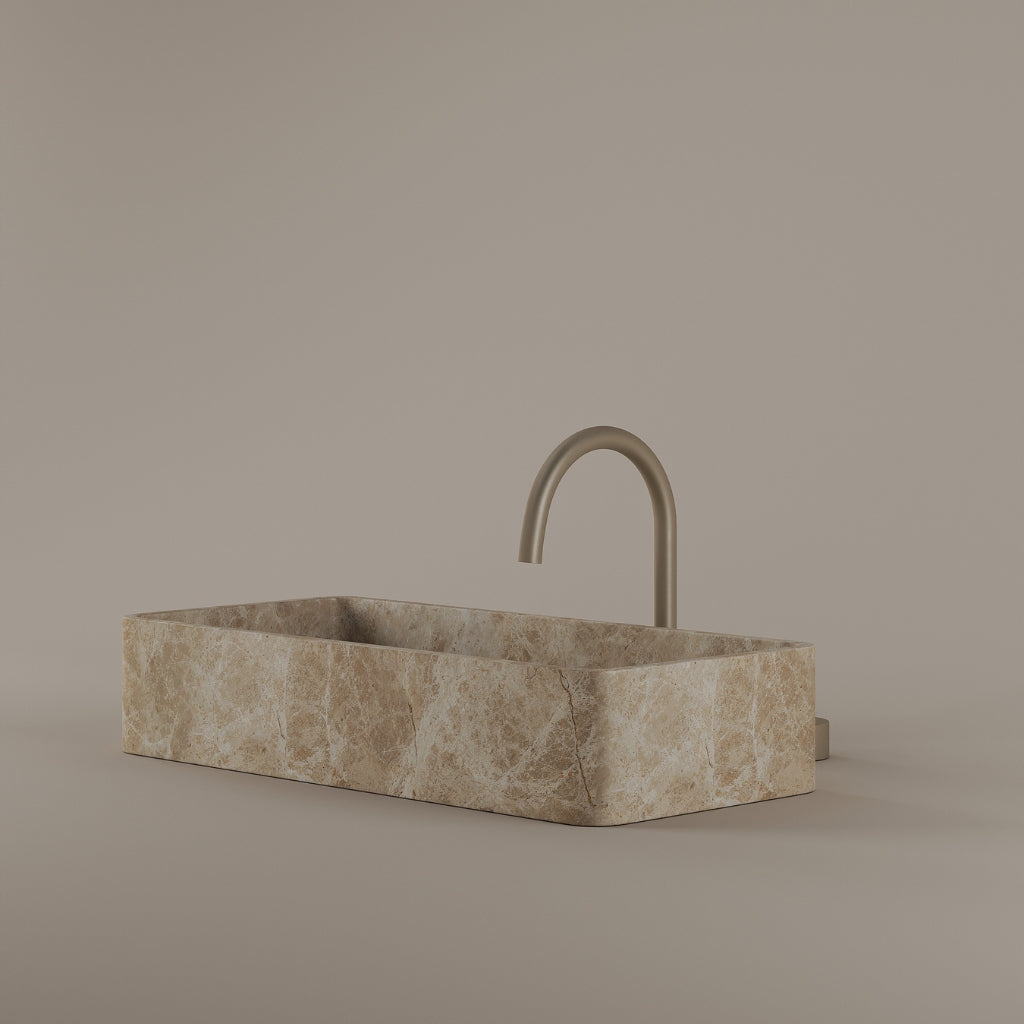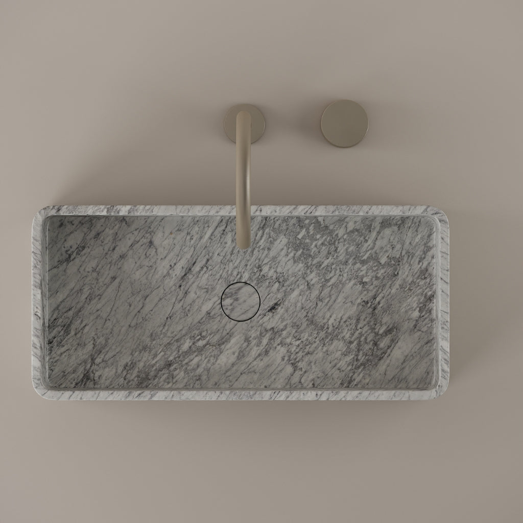 Carved from marble at 24 inches by 11 inches, this rectangular vessel sink features a long and narrow basin. The extended proportions enhance usability while maintaining a clean and directional profile. Its material depth reinforces a modern architectural expression.