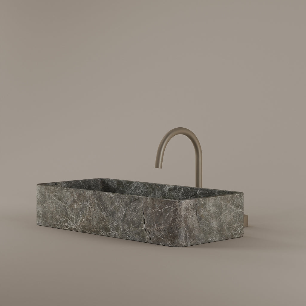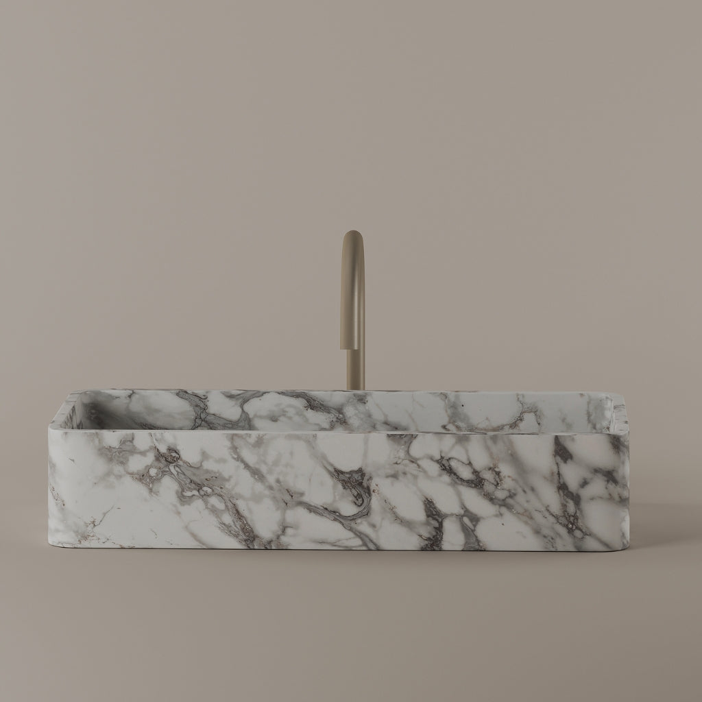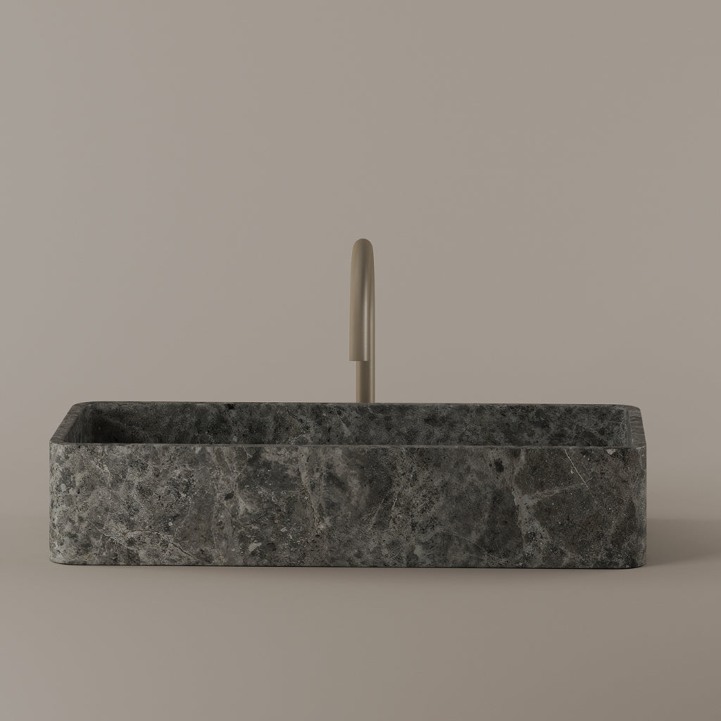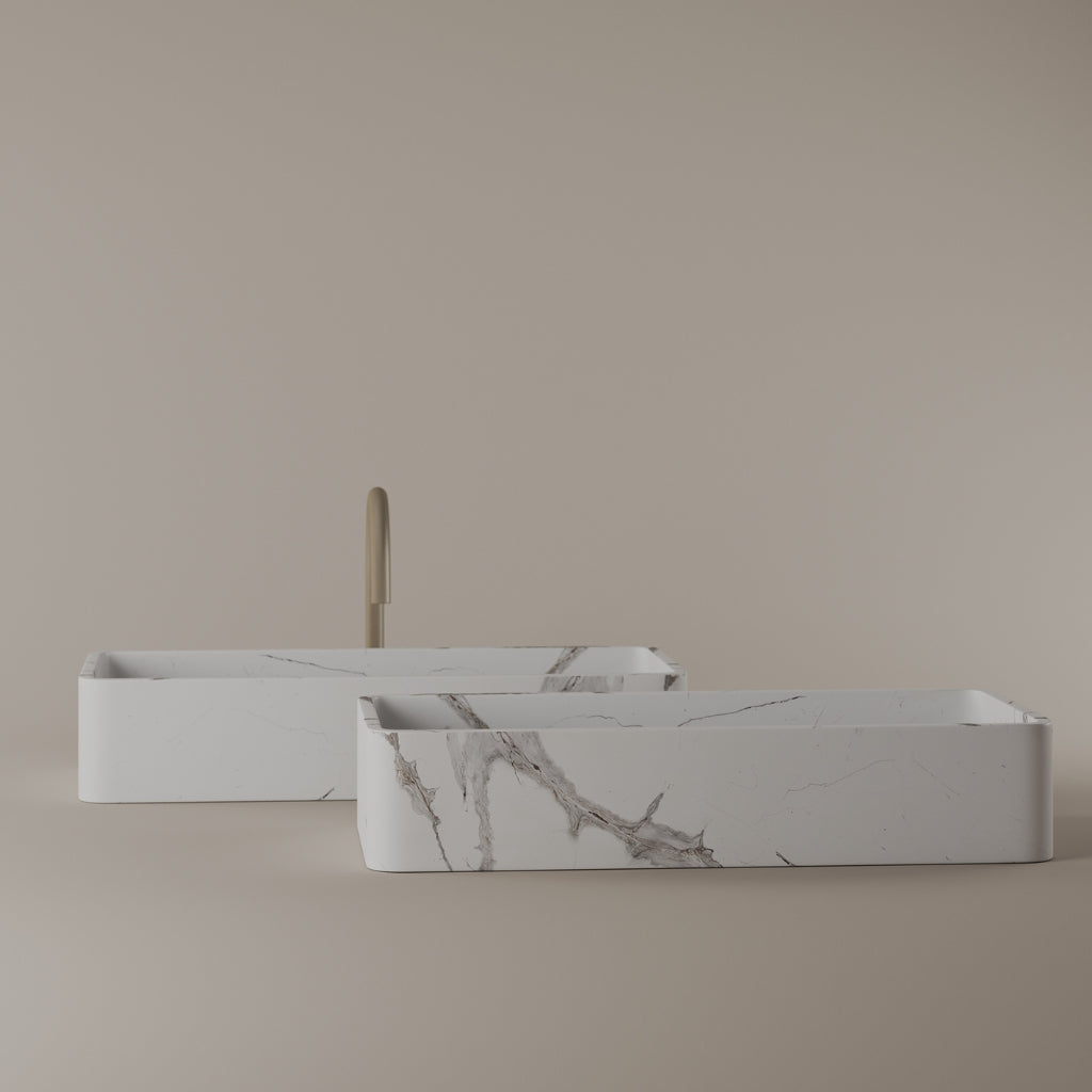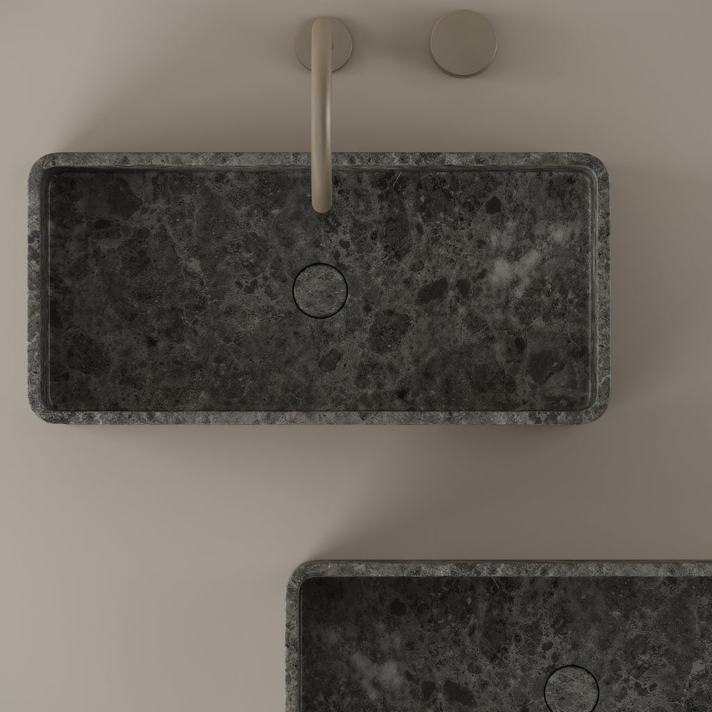Carved from marble at 24 inches by 11 inches, this rectangular vessel sink features a long and narrow basin. The extended proportions enhance usability while maintaining a clean and directional profile. Its material depth reinforces a modern architectural expression.