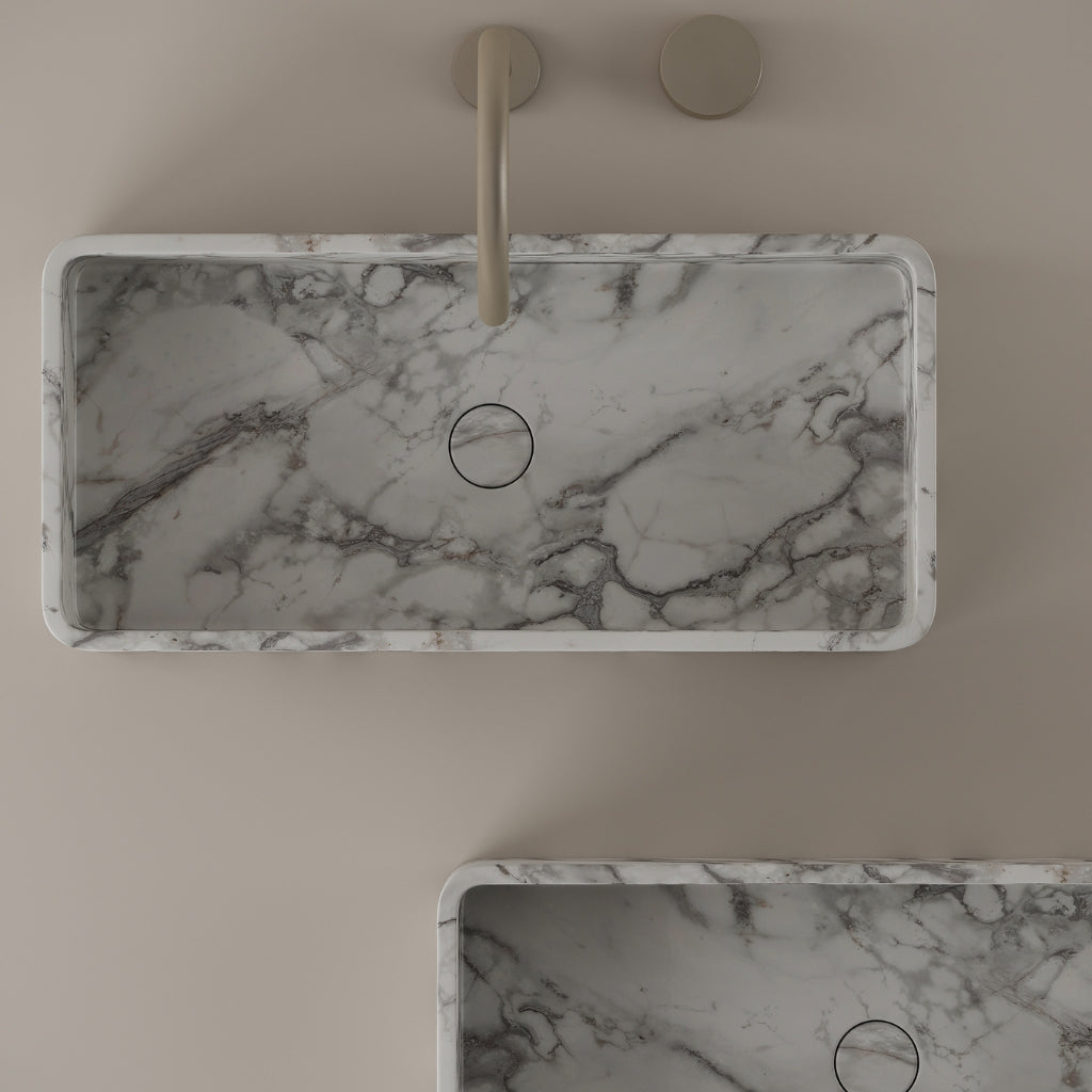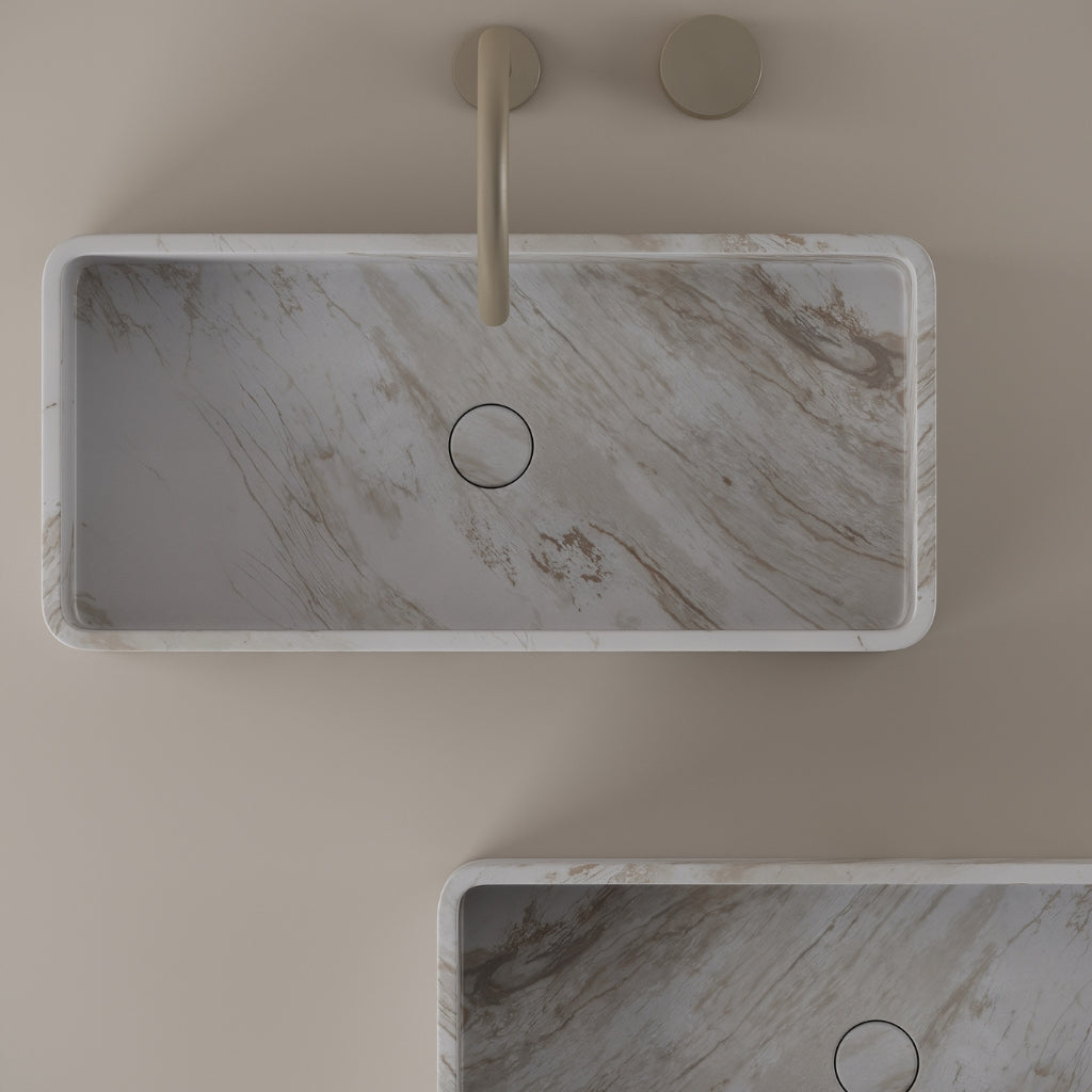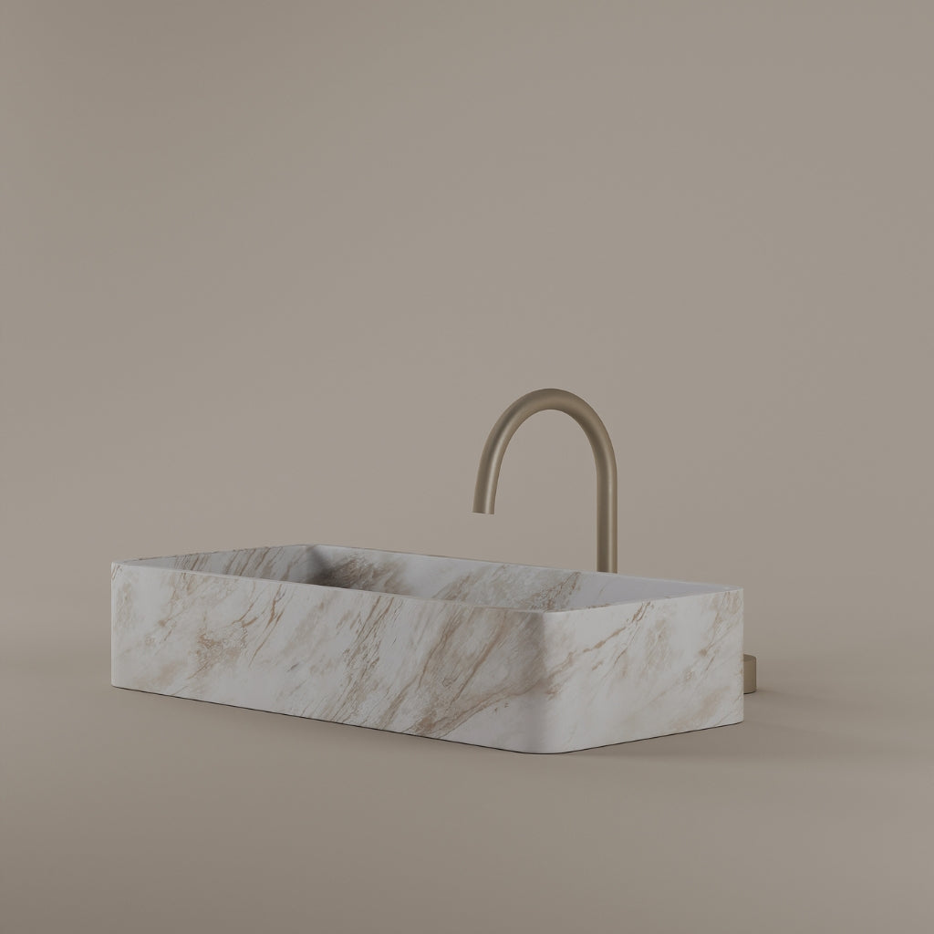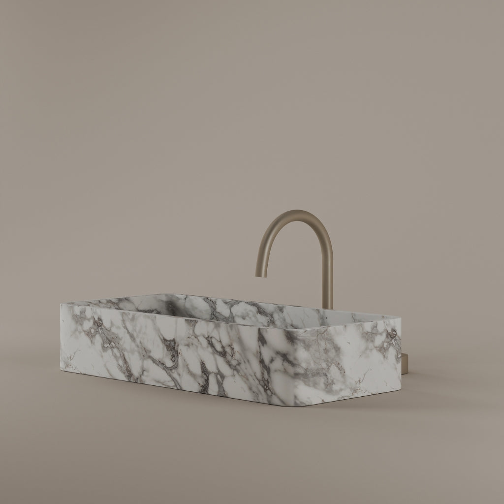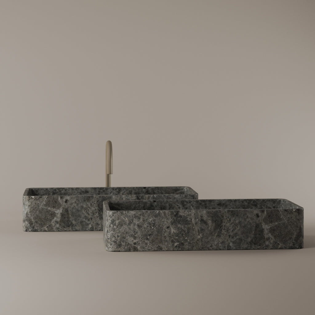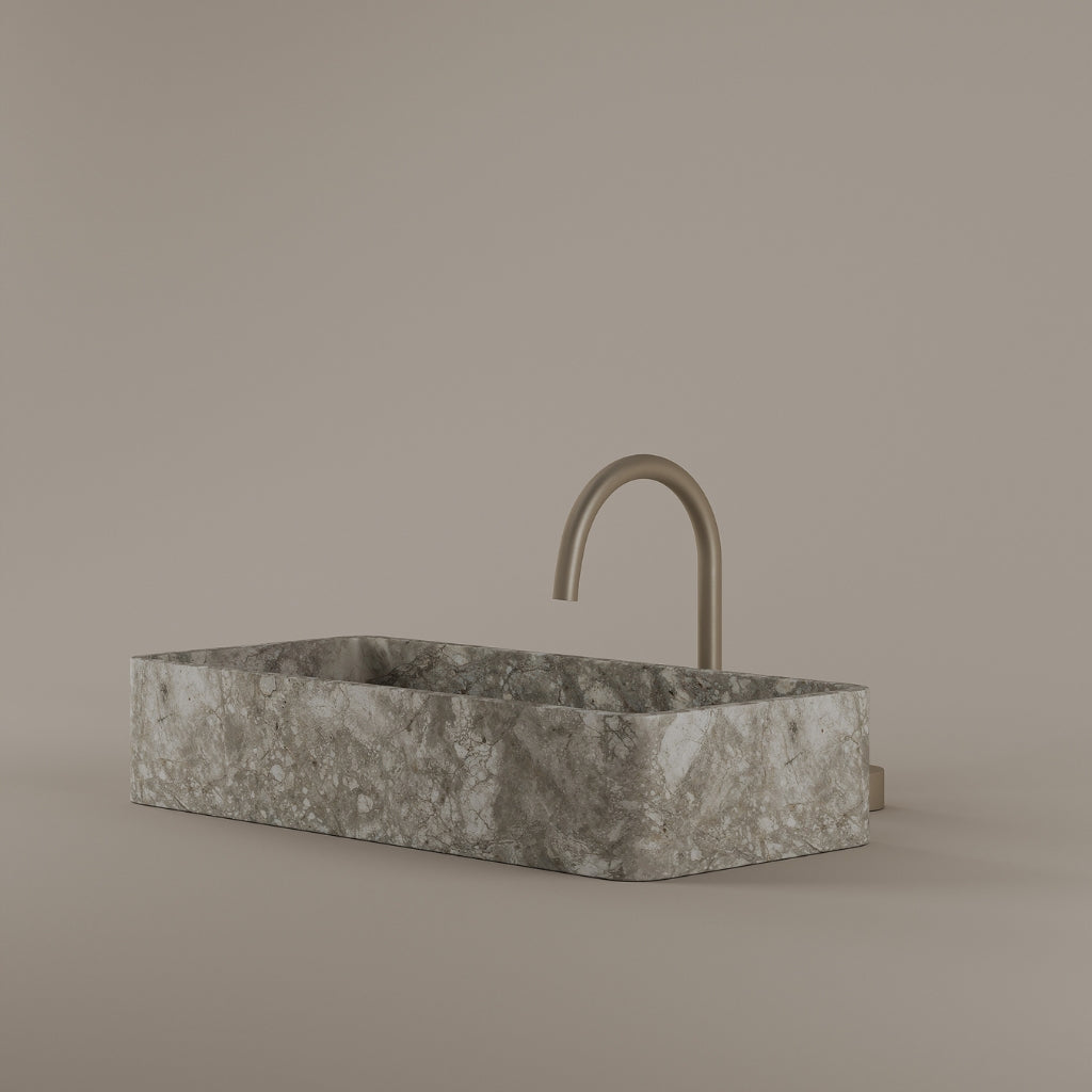 Carved from marble at 24 inches by 11 inches, this rectangular vessel sink features a long and narrow basin. The extended proportions enhance usability while maintaining a clean and directional profile. Its material depth reinforces a modern architectural expression.