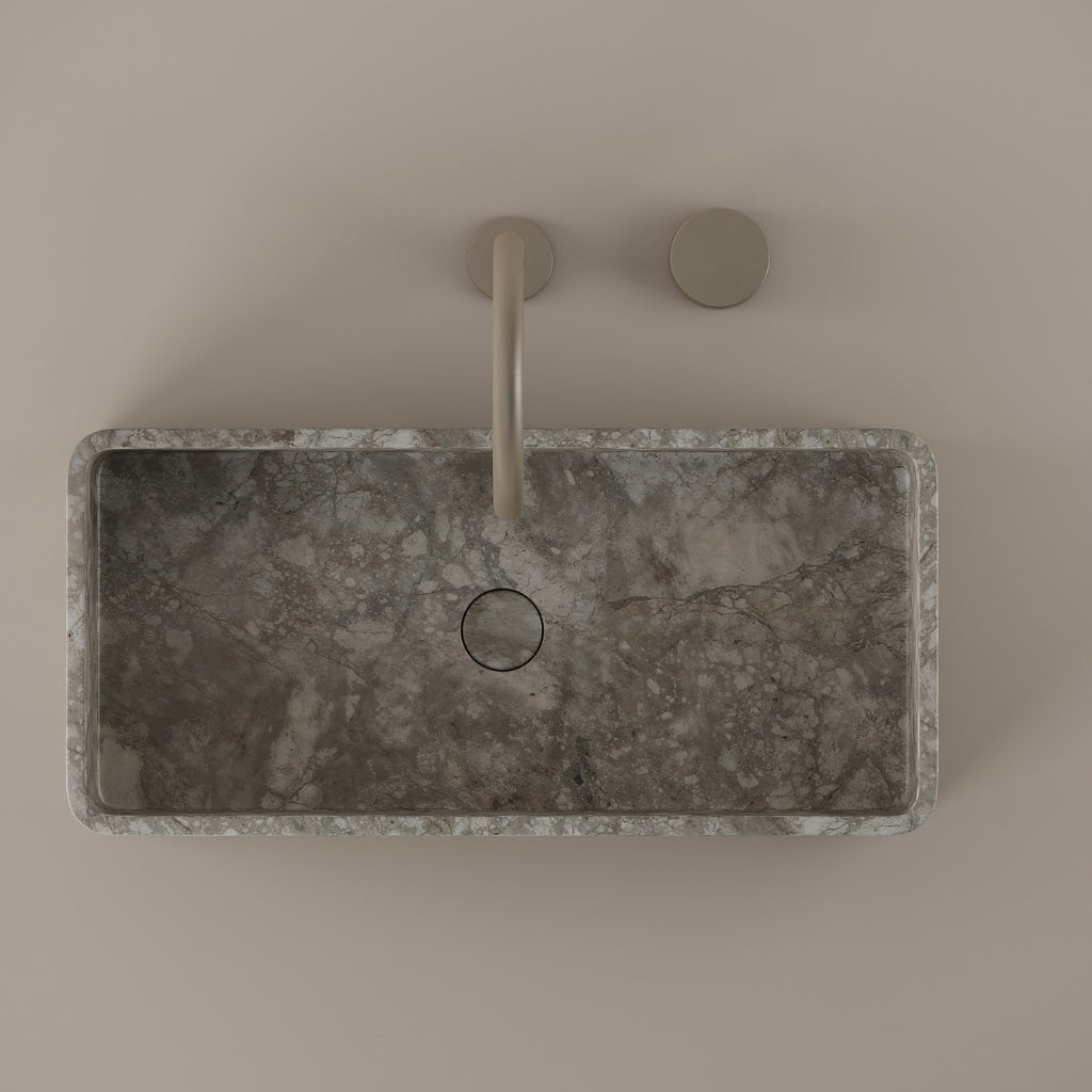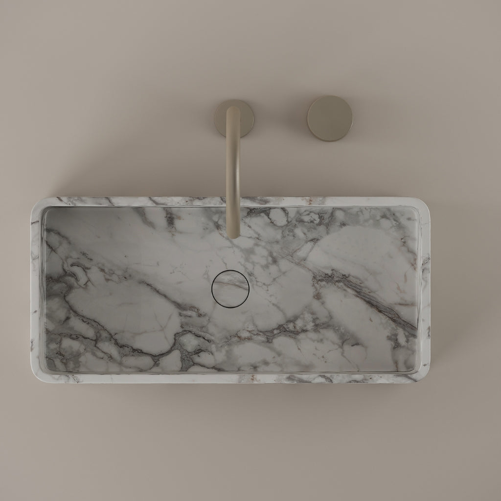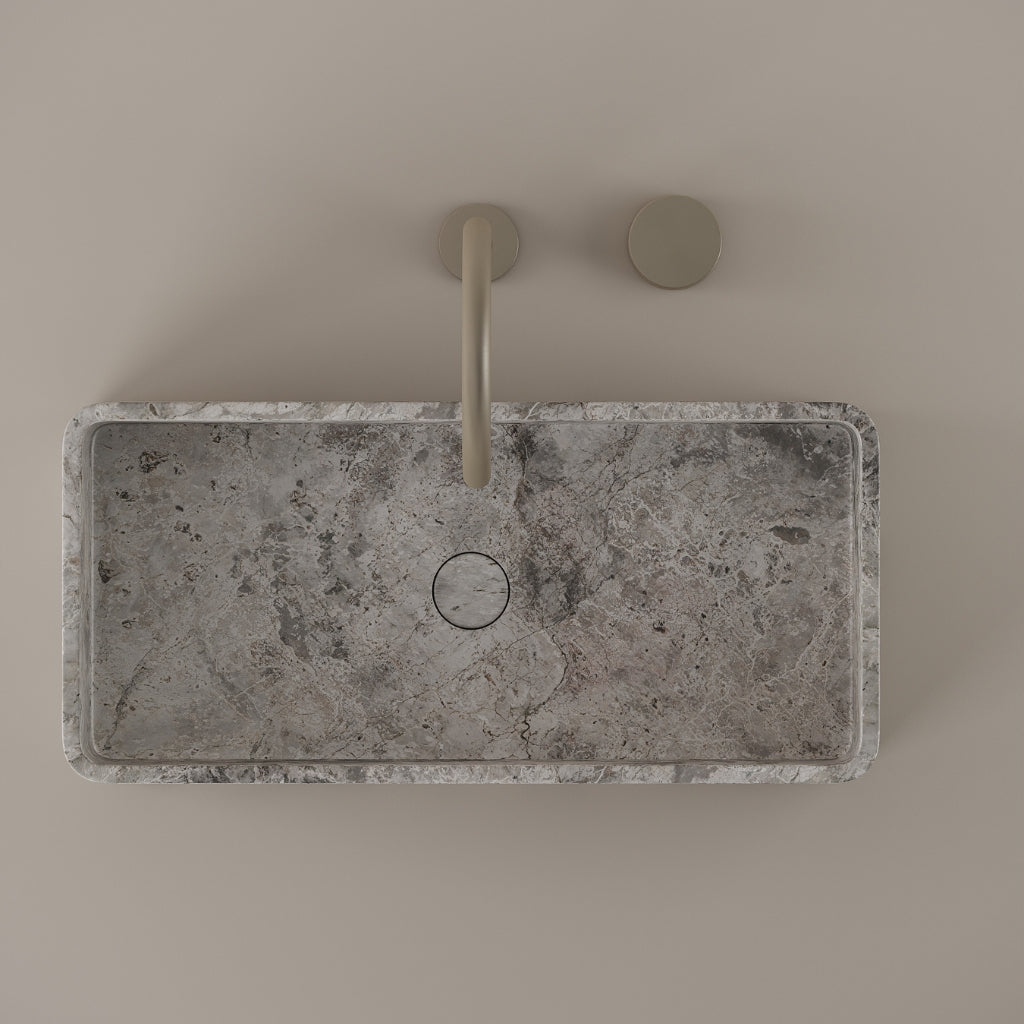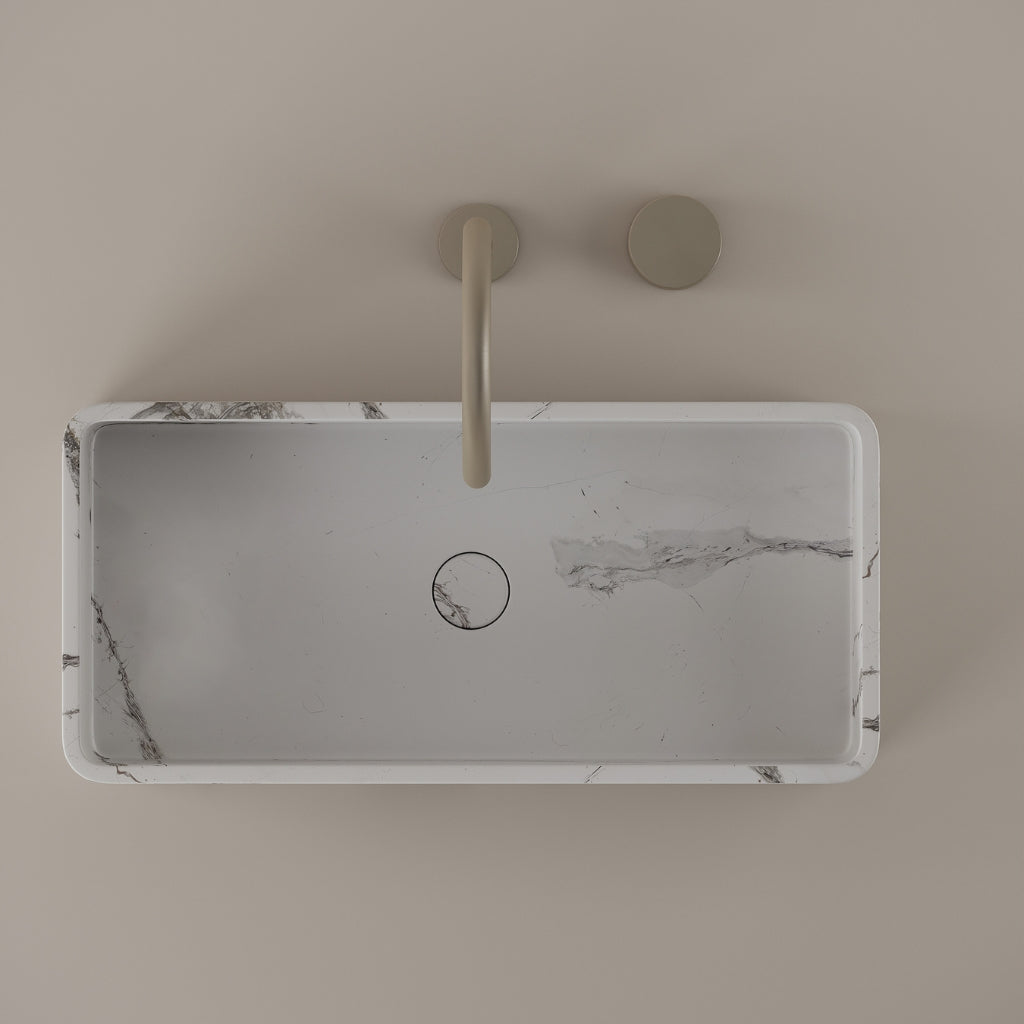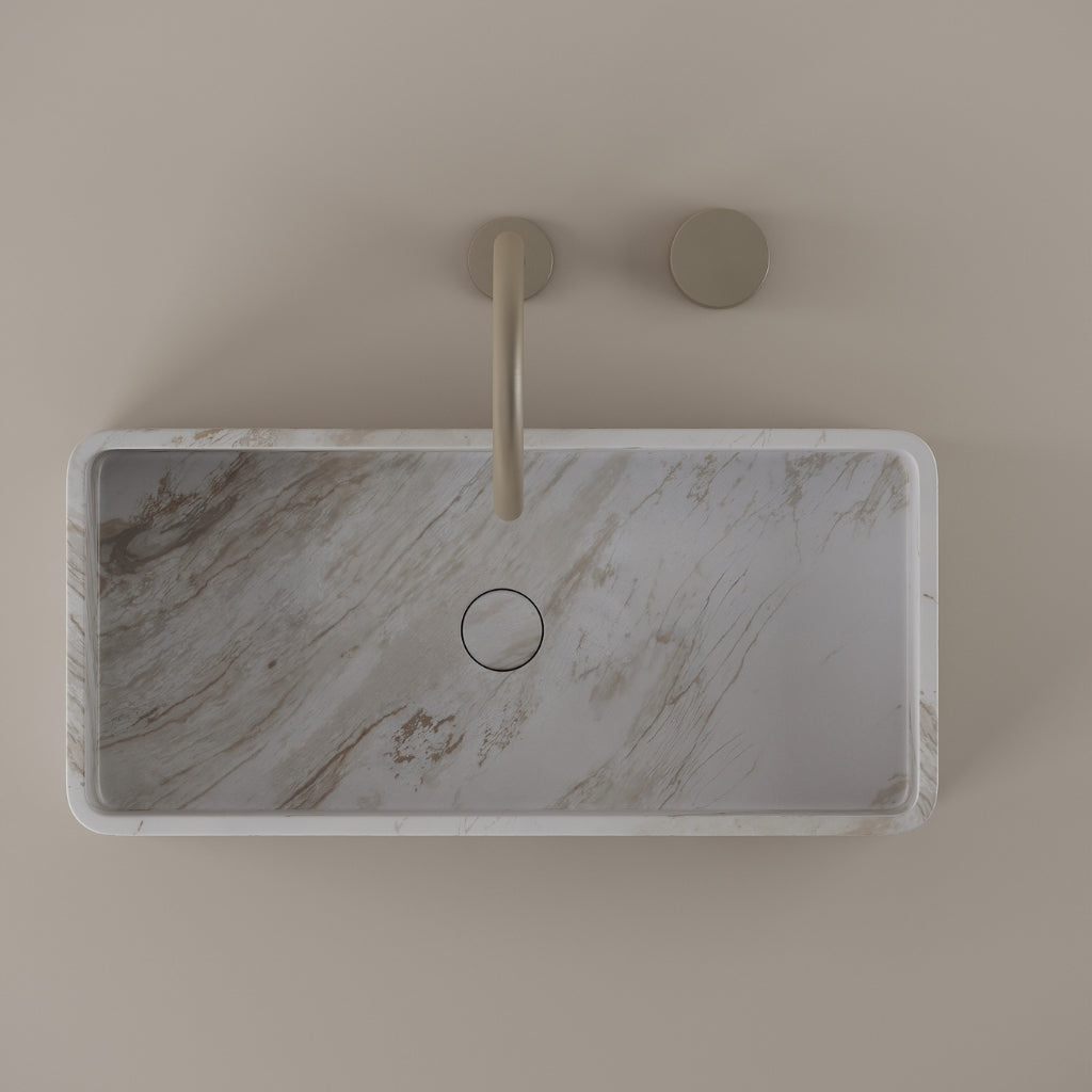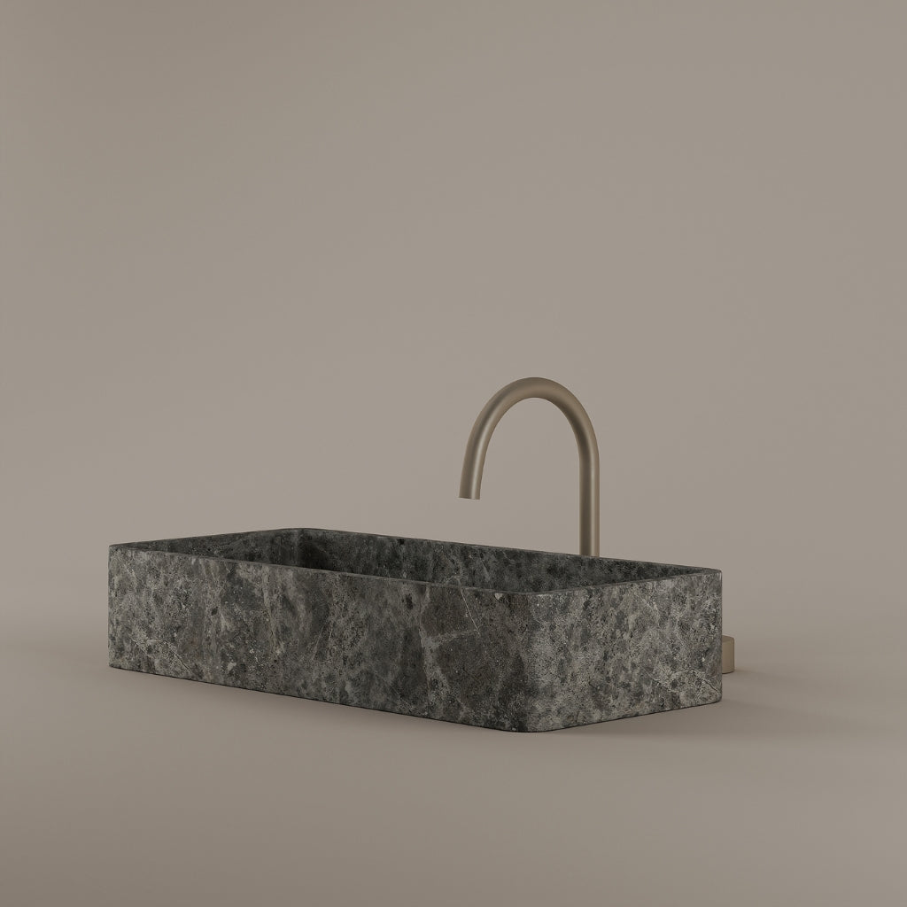 Carved from marble at 24 inches by 11 inches, this rectangular vessel sink features a long and narrow basin. The extended proportions enhance usability while maintaining a clean and directional profile. Its material depth reinforces a modern architectural expression.