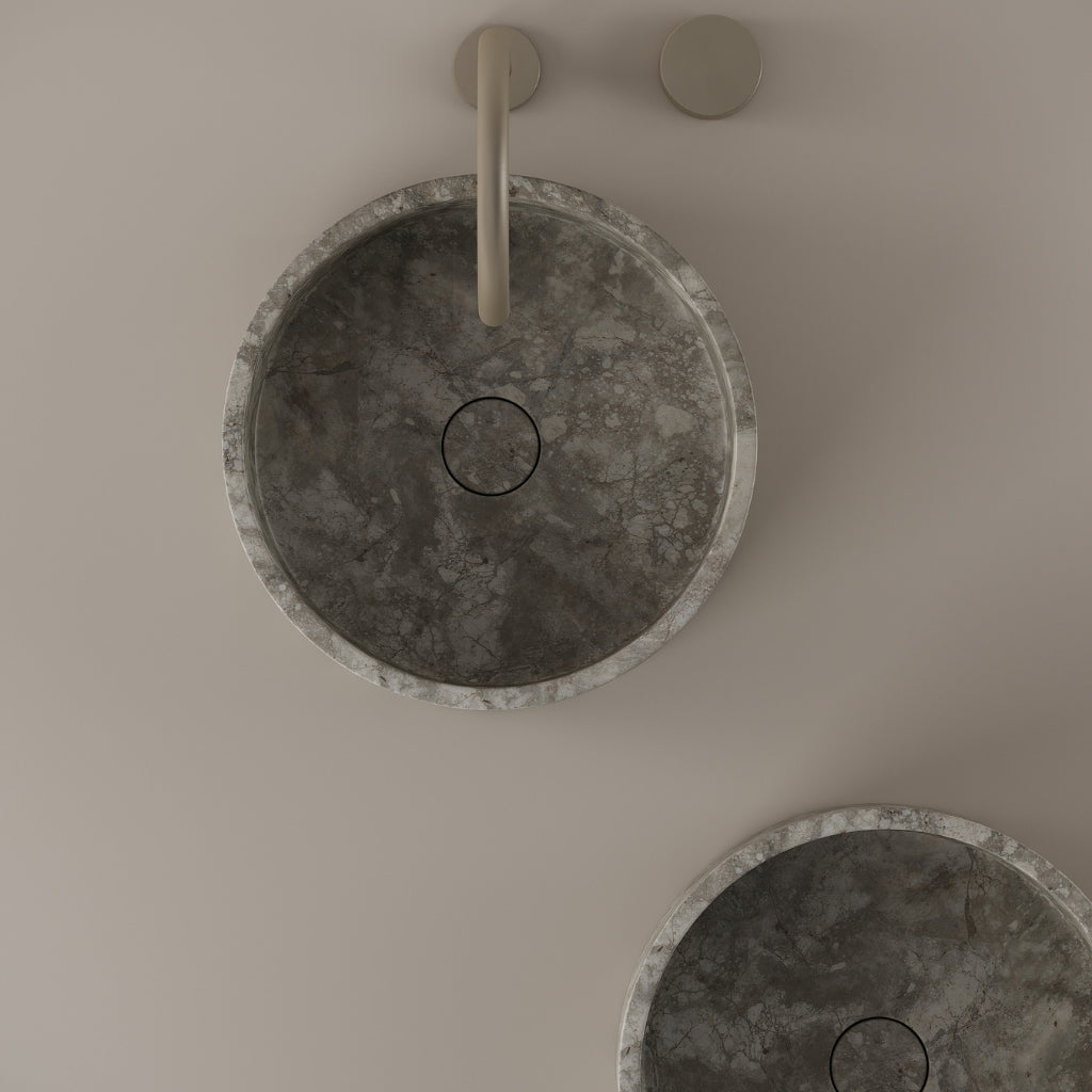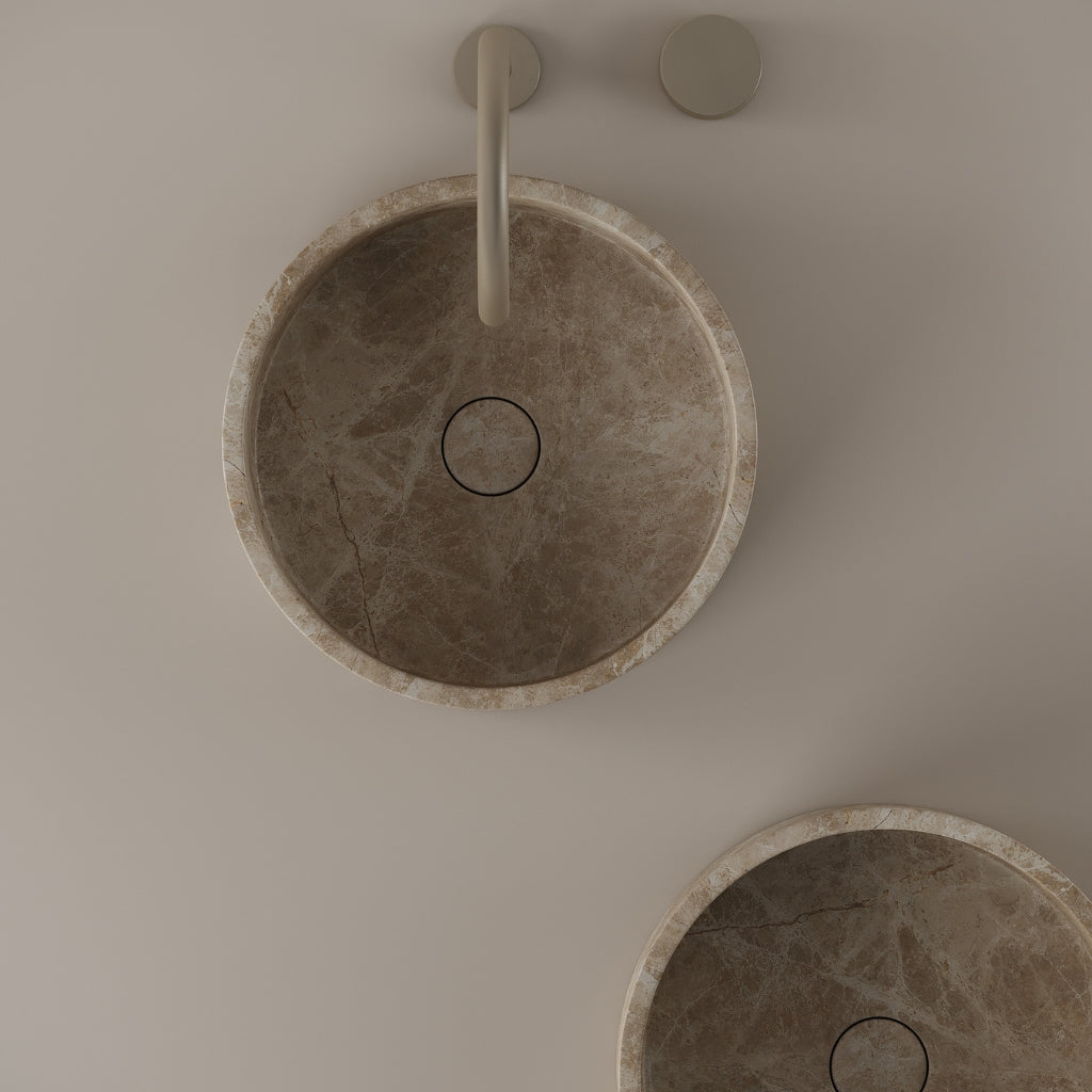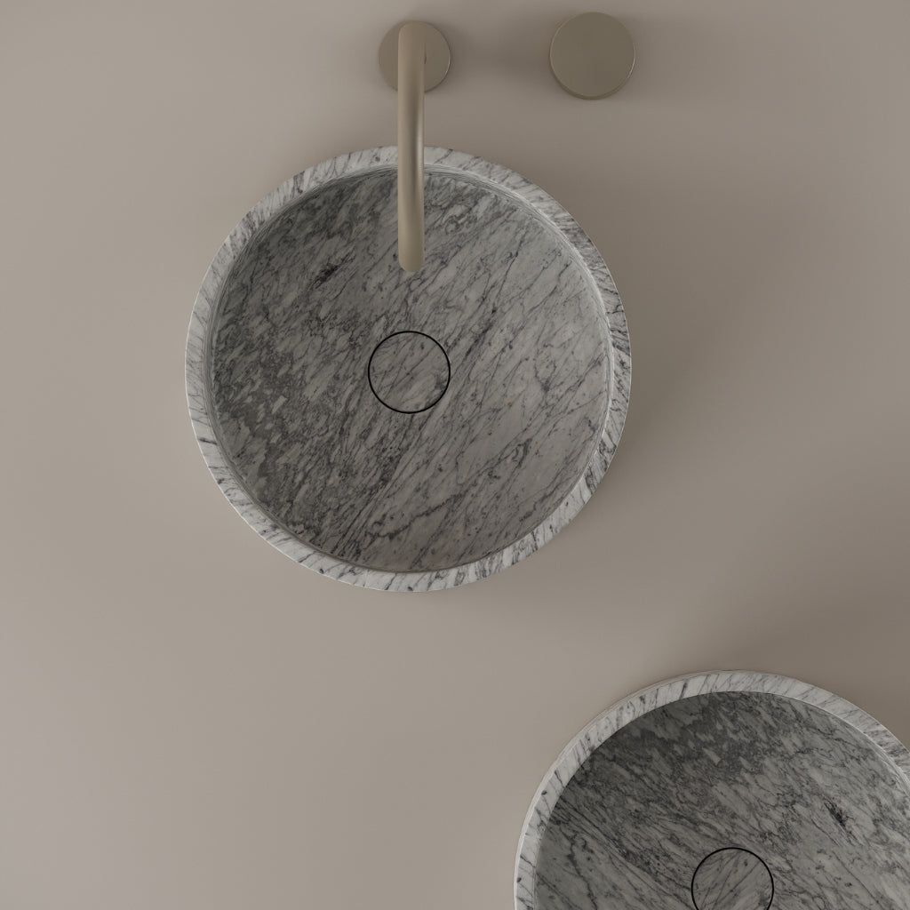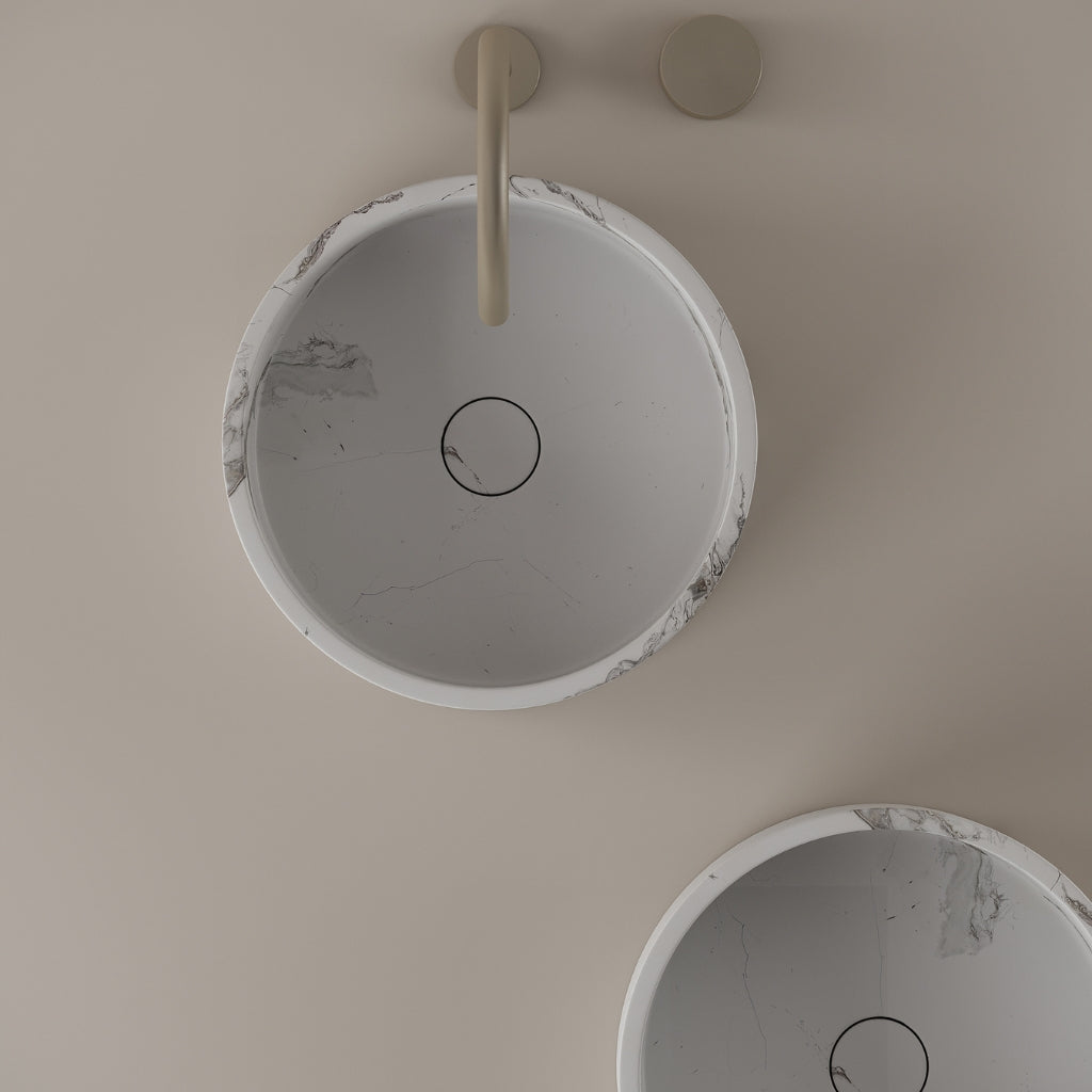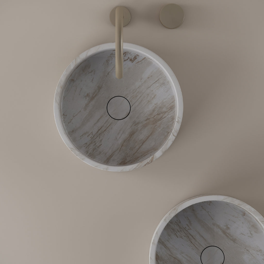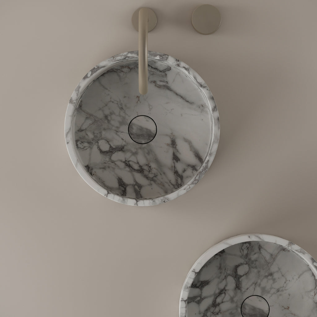 Carved from marble at 14 inches, this round vessel sink presents a defined circular basin with a balanced edge. The smooth interior supports daily use while maintaining a composed form. Its surface variation adds depth to modern bathroom spaces.