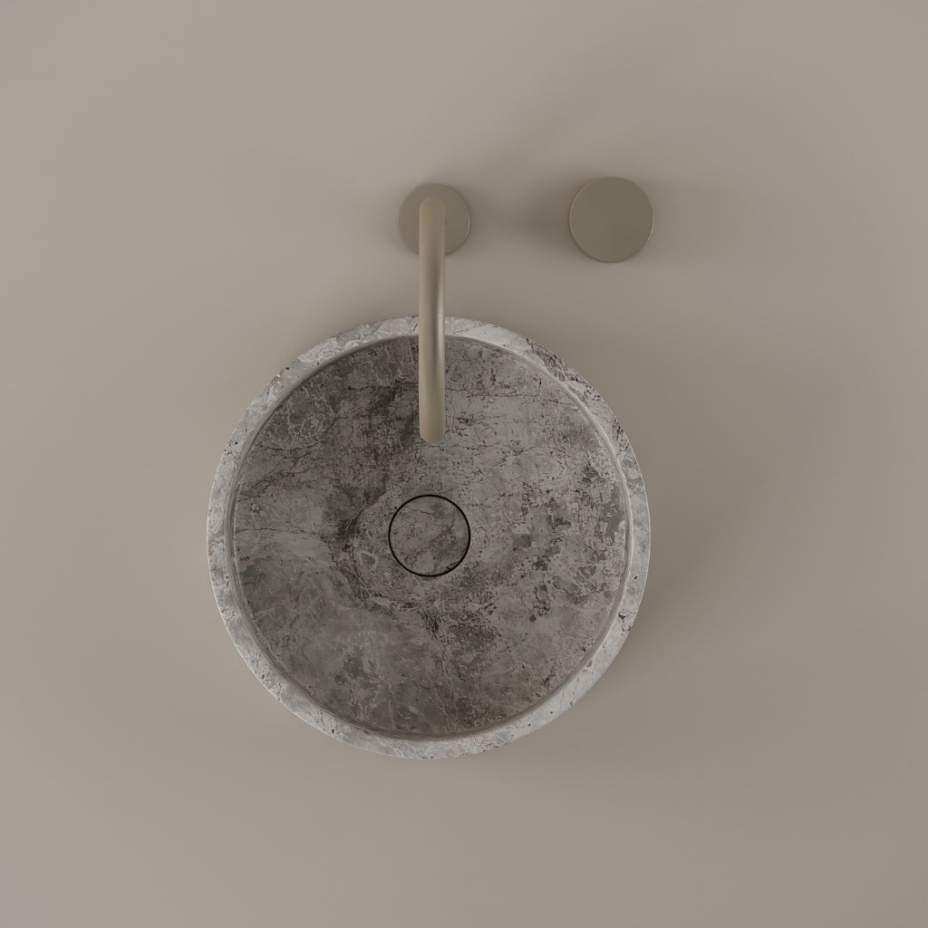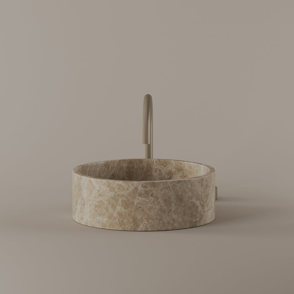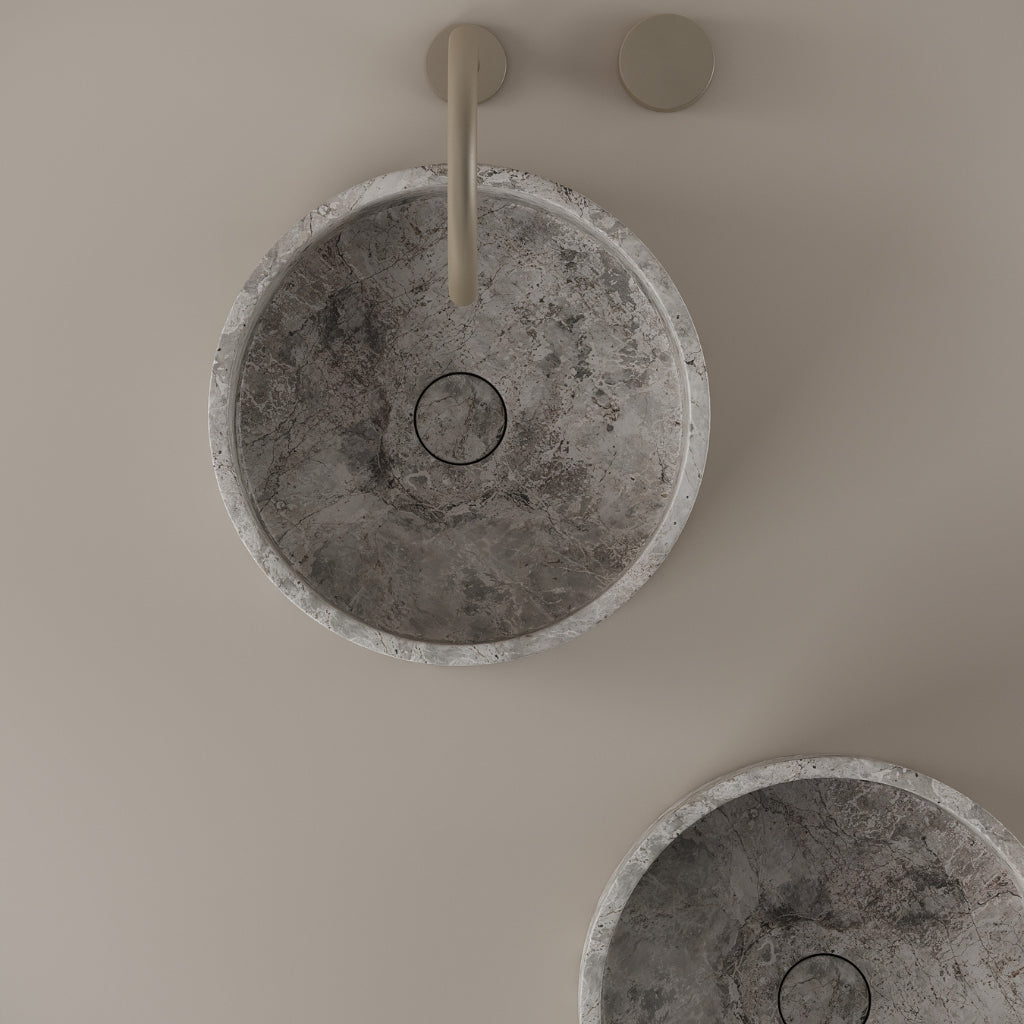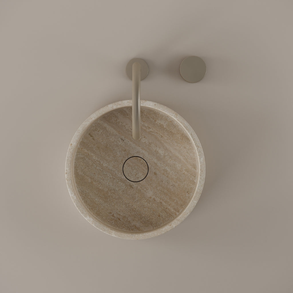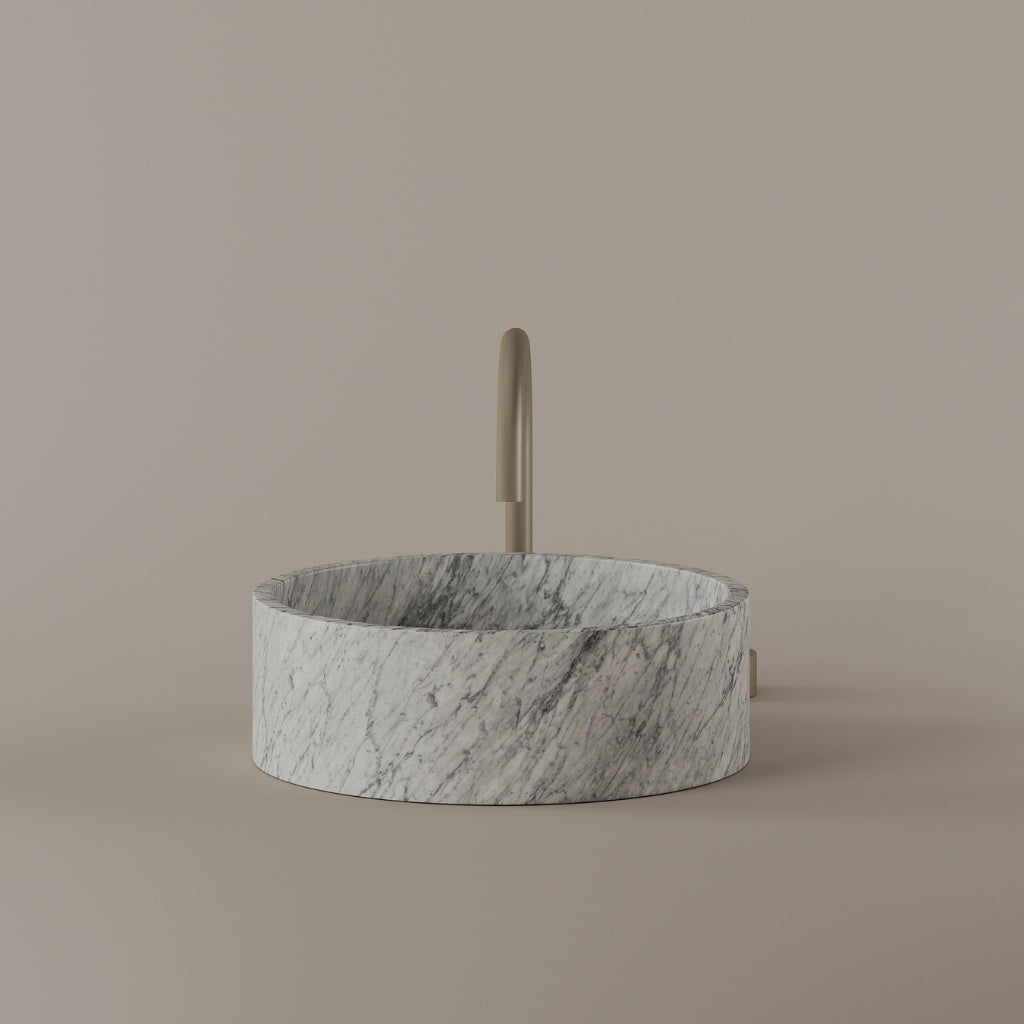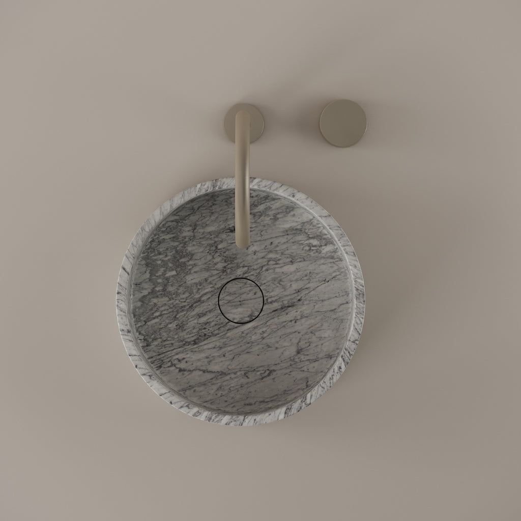 Carved from marble at 14 inches, this round vessel sink presents a defined circular basin with a balanced edge. The smooth interior supports daily use while maintaining a composed form. Its surface variation adds depth to modern bathroom spaces.