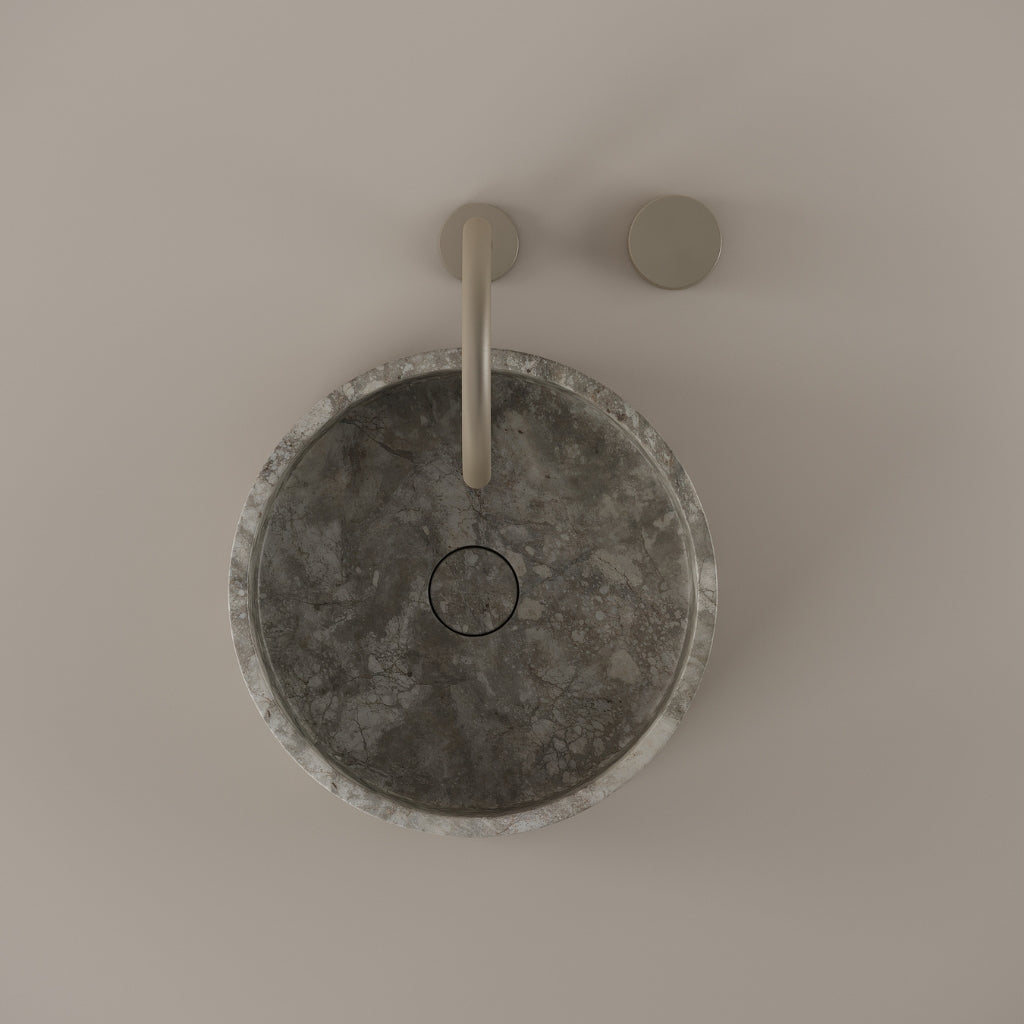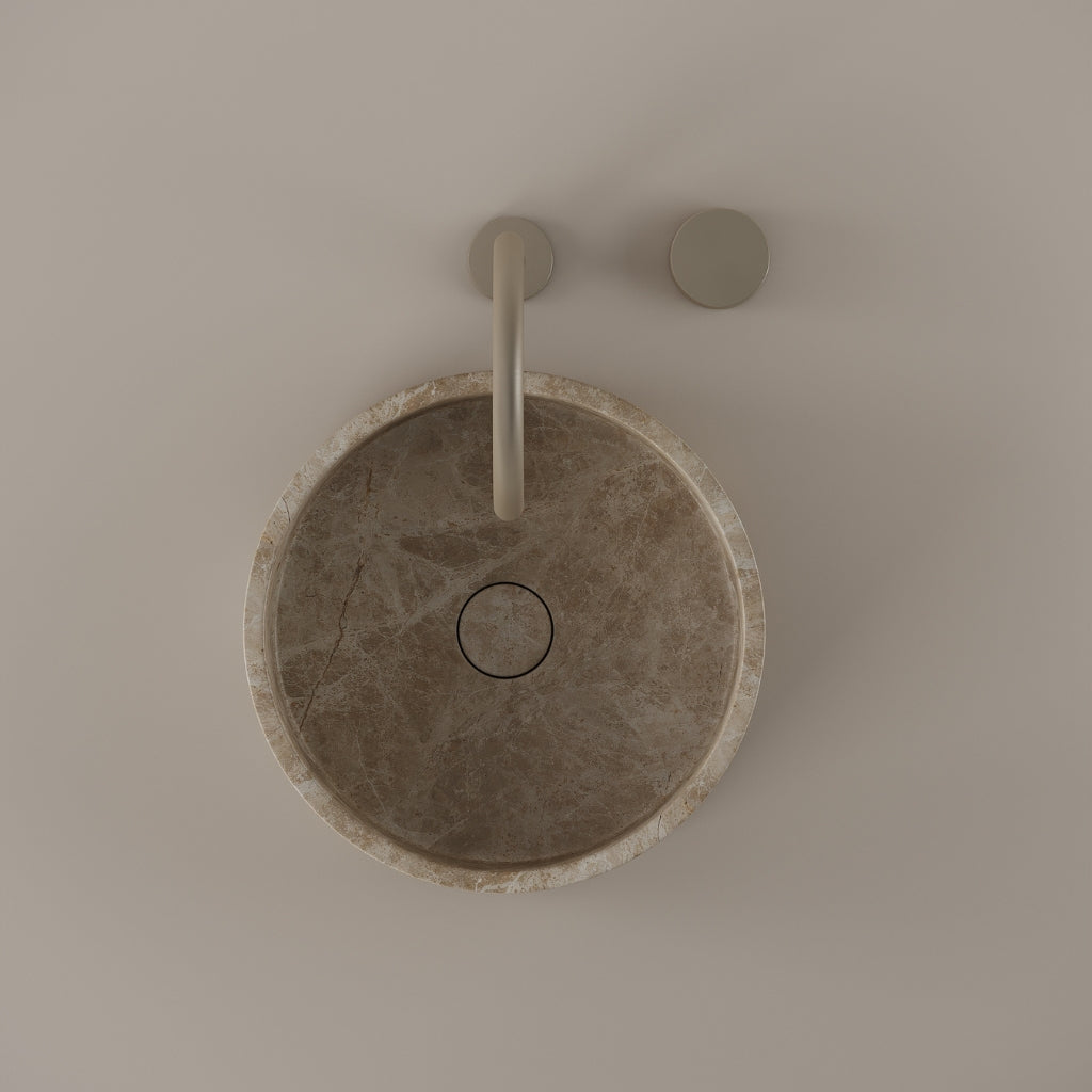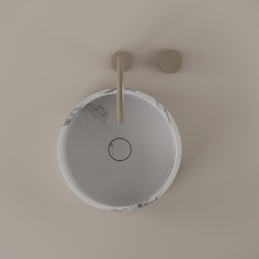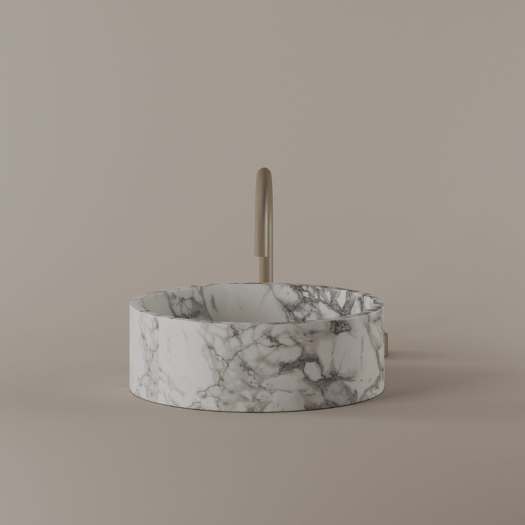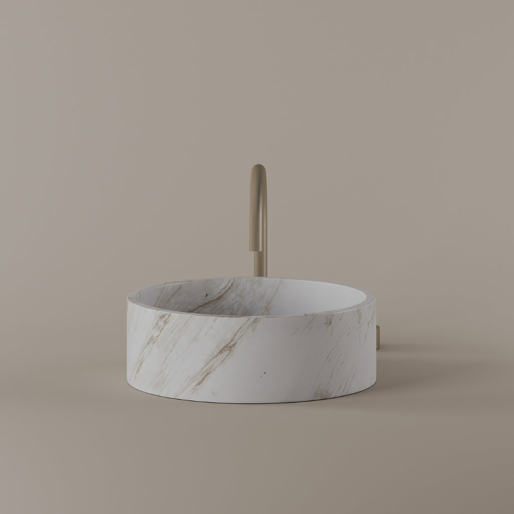 Carved from marble at 14 inches, this round vessel sink presents a defined circular basin with a balanced edge. The smooth interior supports daily use while maintaining a composed form. Its surface variation adds depth to modern bathroom spaces.