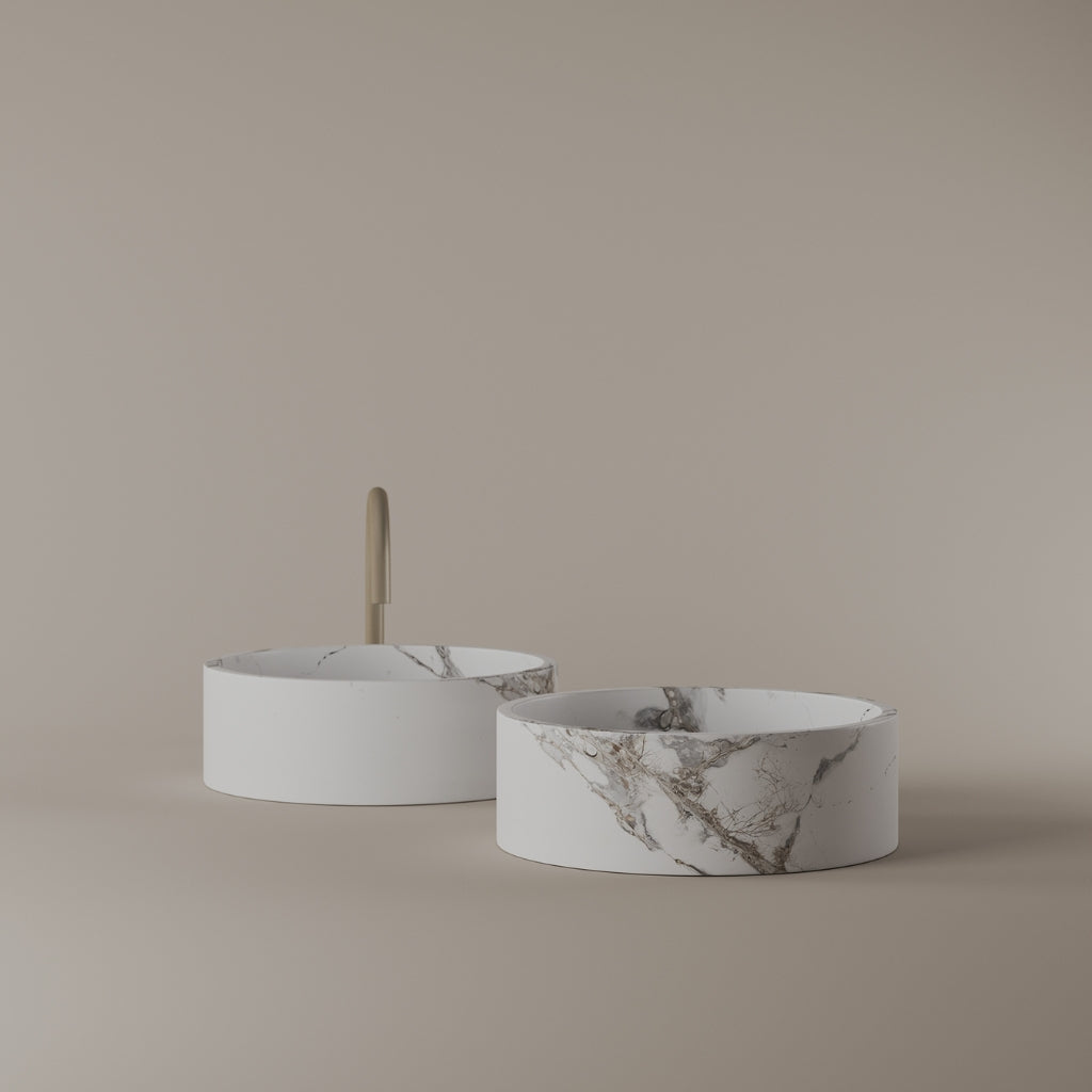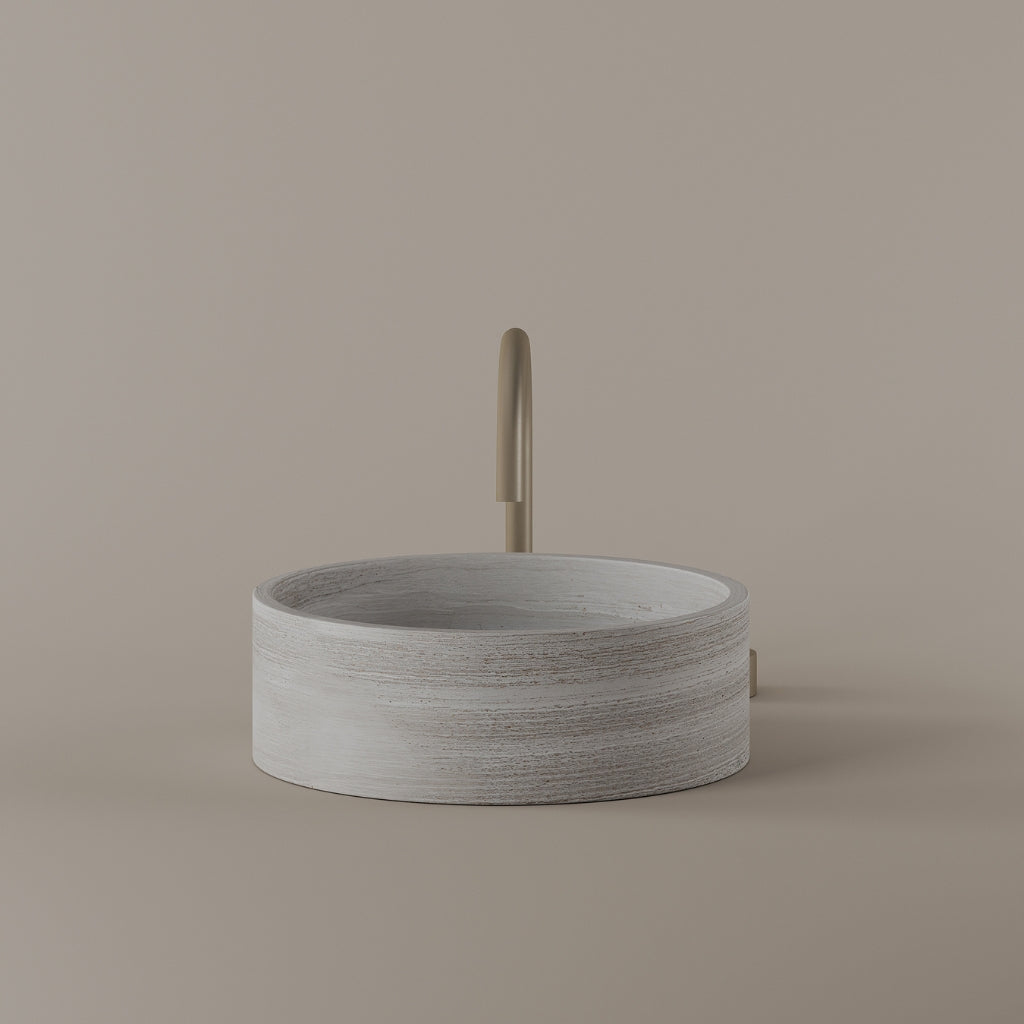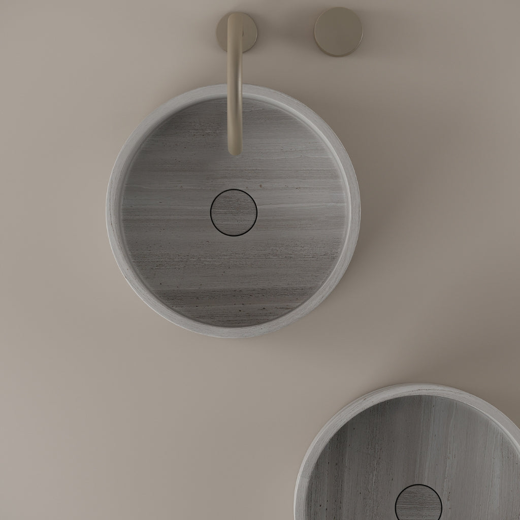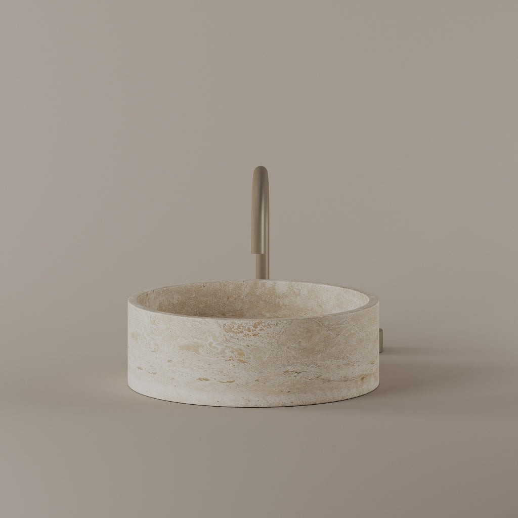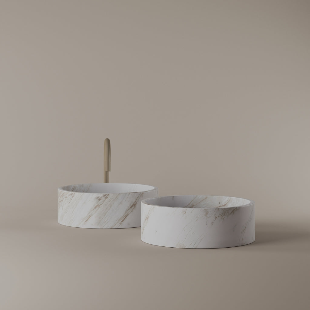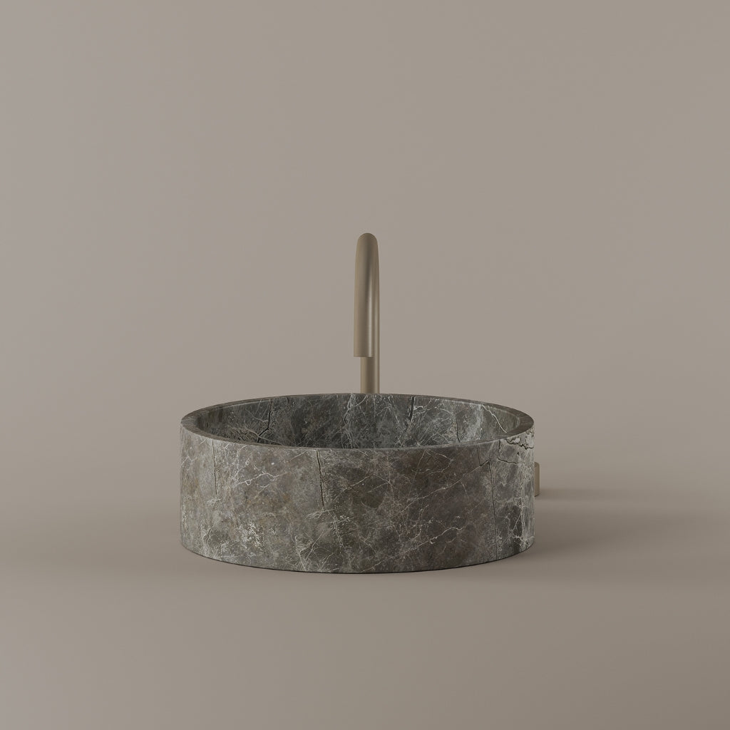 Carved from marble at 14 inches, this round vessel sink presents a defined circular basin with a balanced edge. The smooth interior supports daily use while maintaining a composed form. Its surface variation adds depth to modern bathroom spaces.